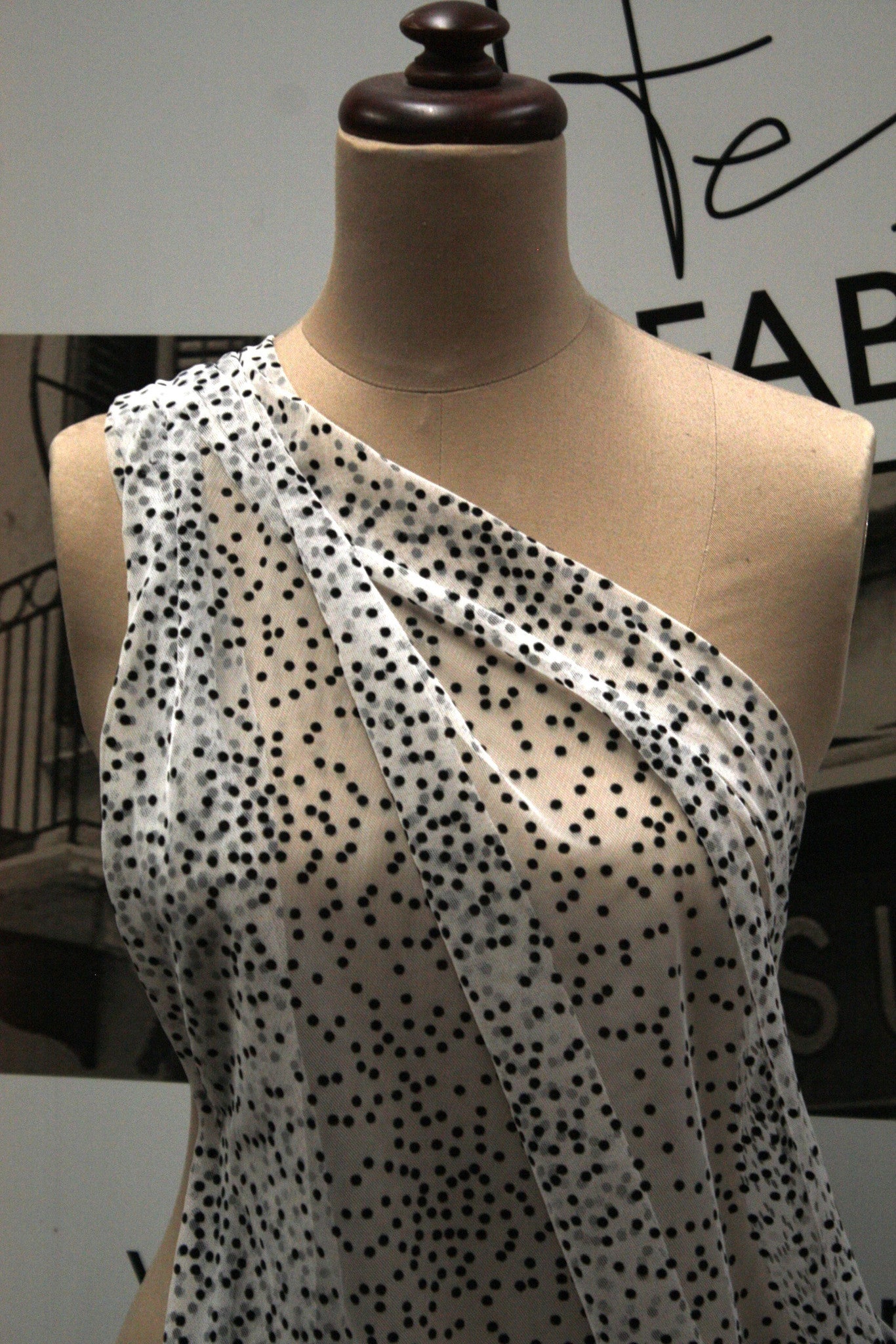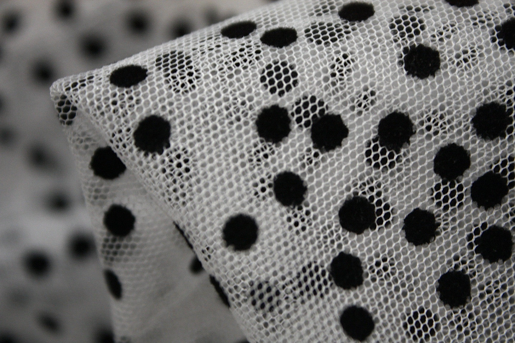 100% Nylon white tulle base with black flocked velvet spot. Width:145cm
