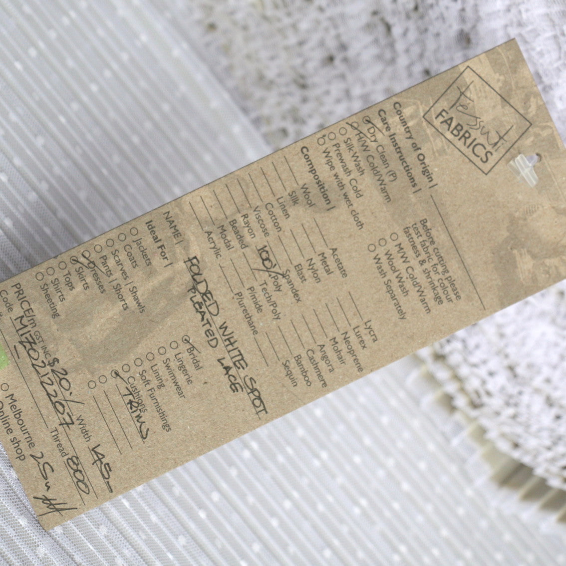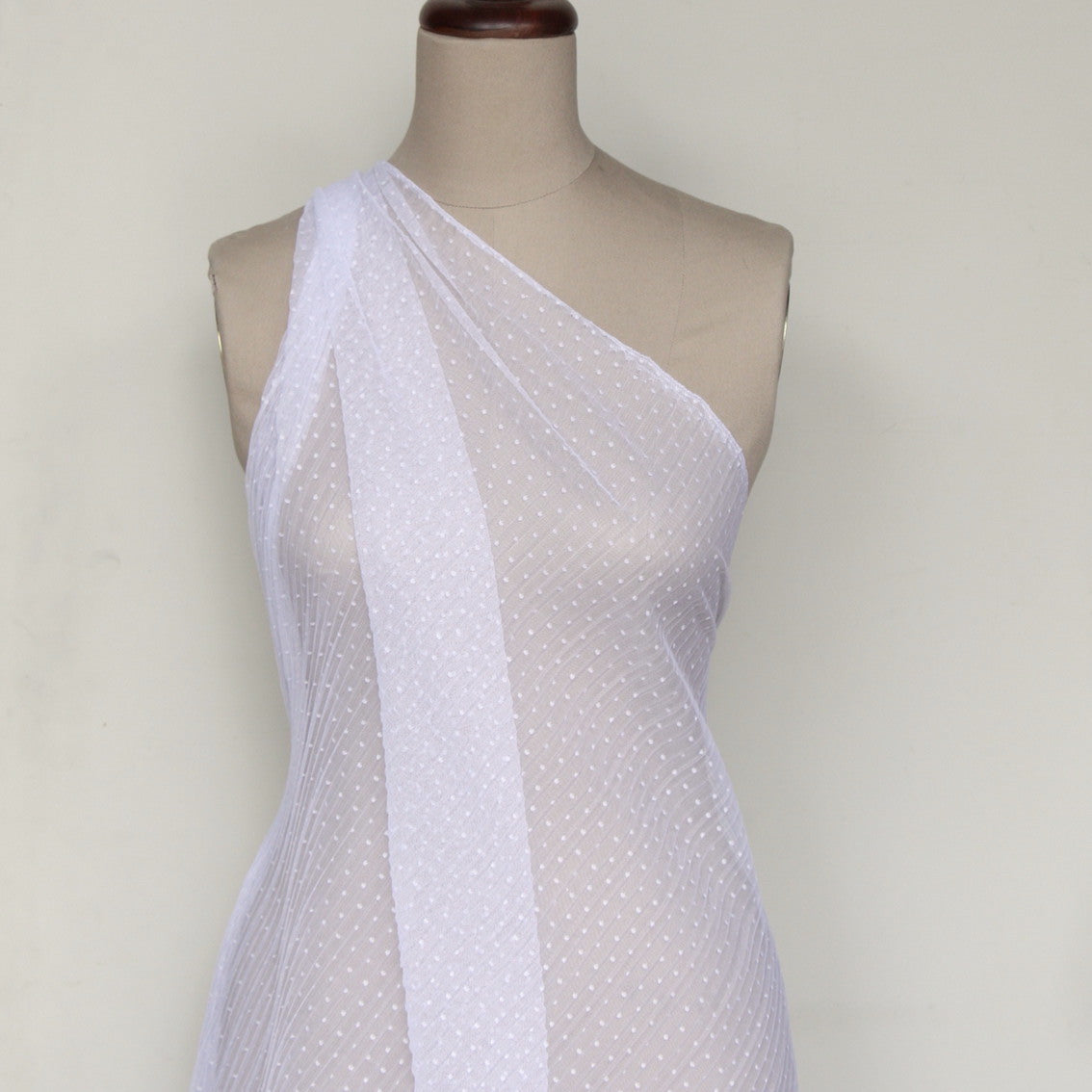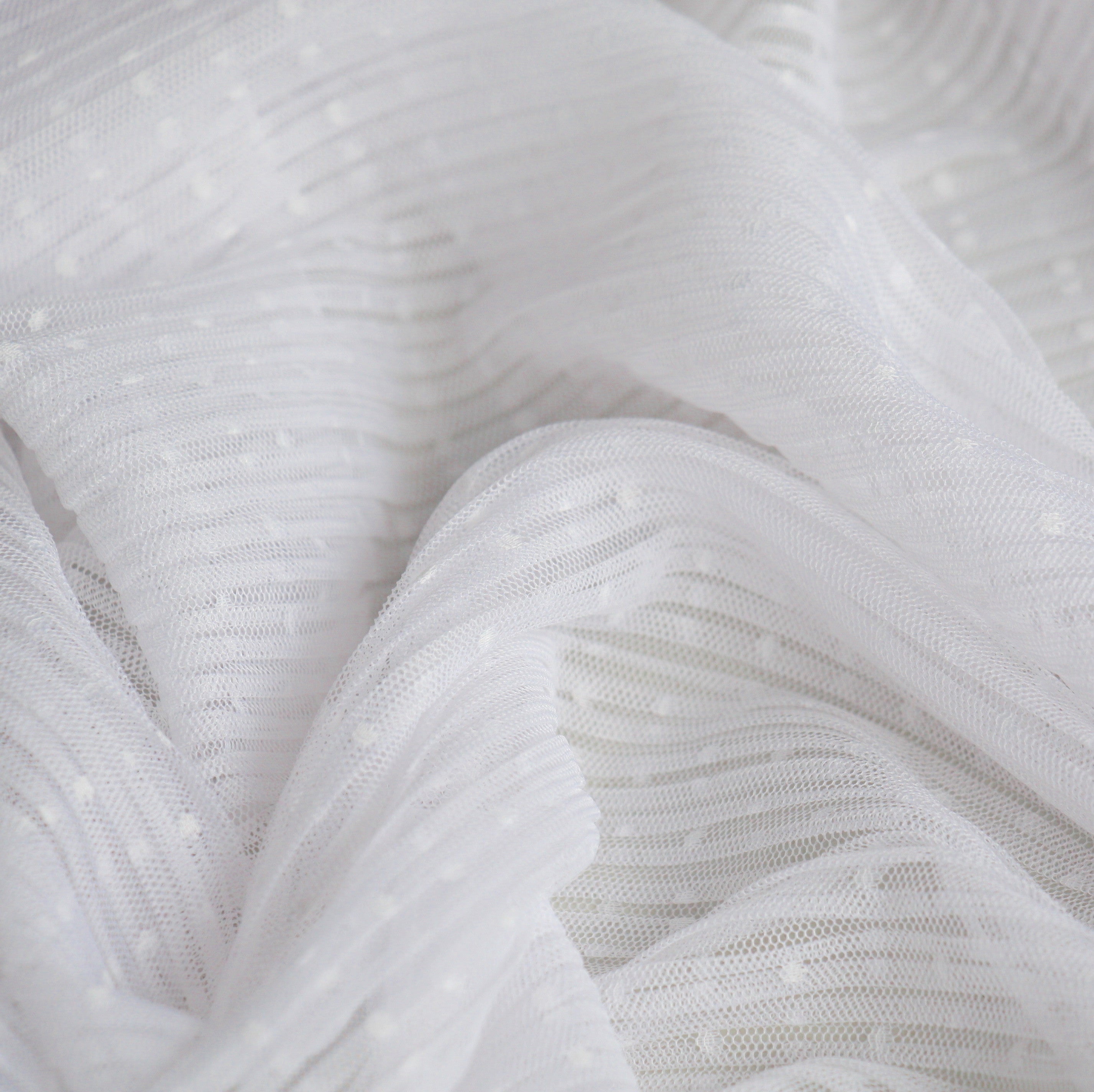 Designer end white spotted pleated 100% polyester tulle. Width: 145cm