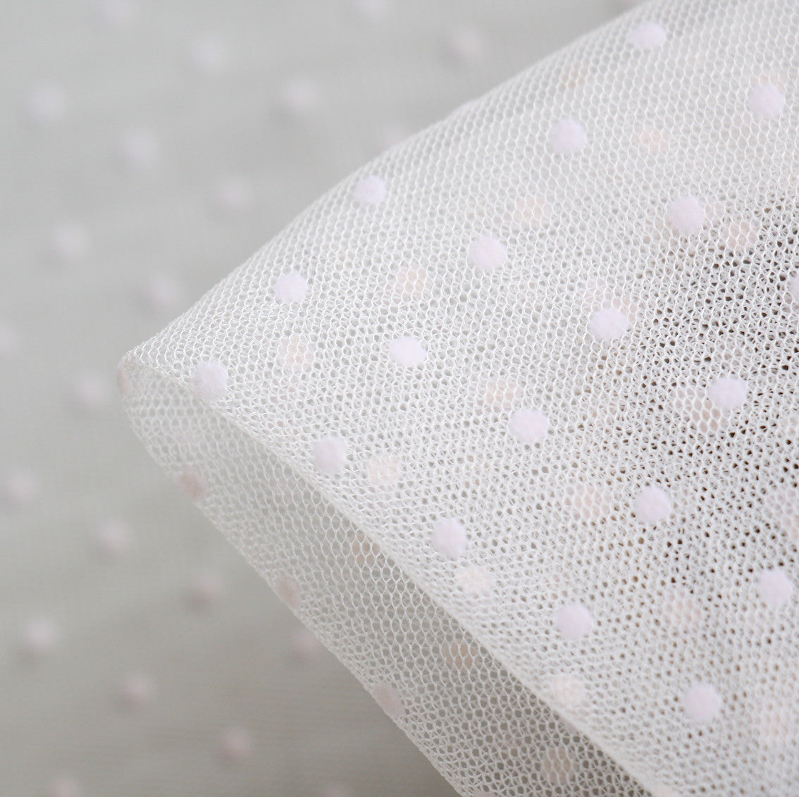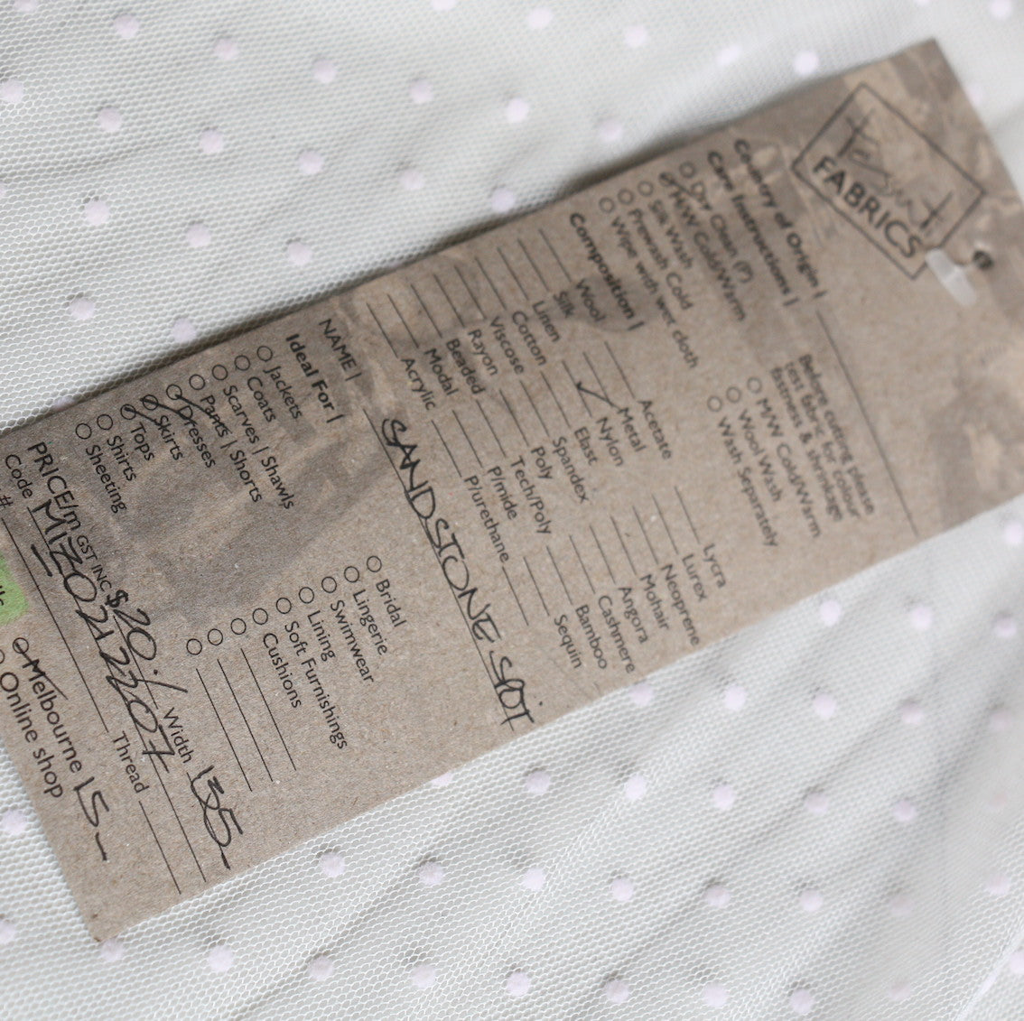 Designer end ivory 100% nylon tulle with latte flock spot. Width: 135cm