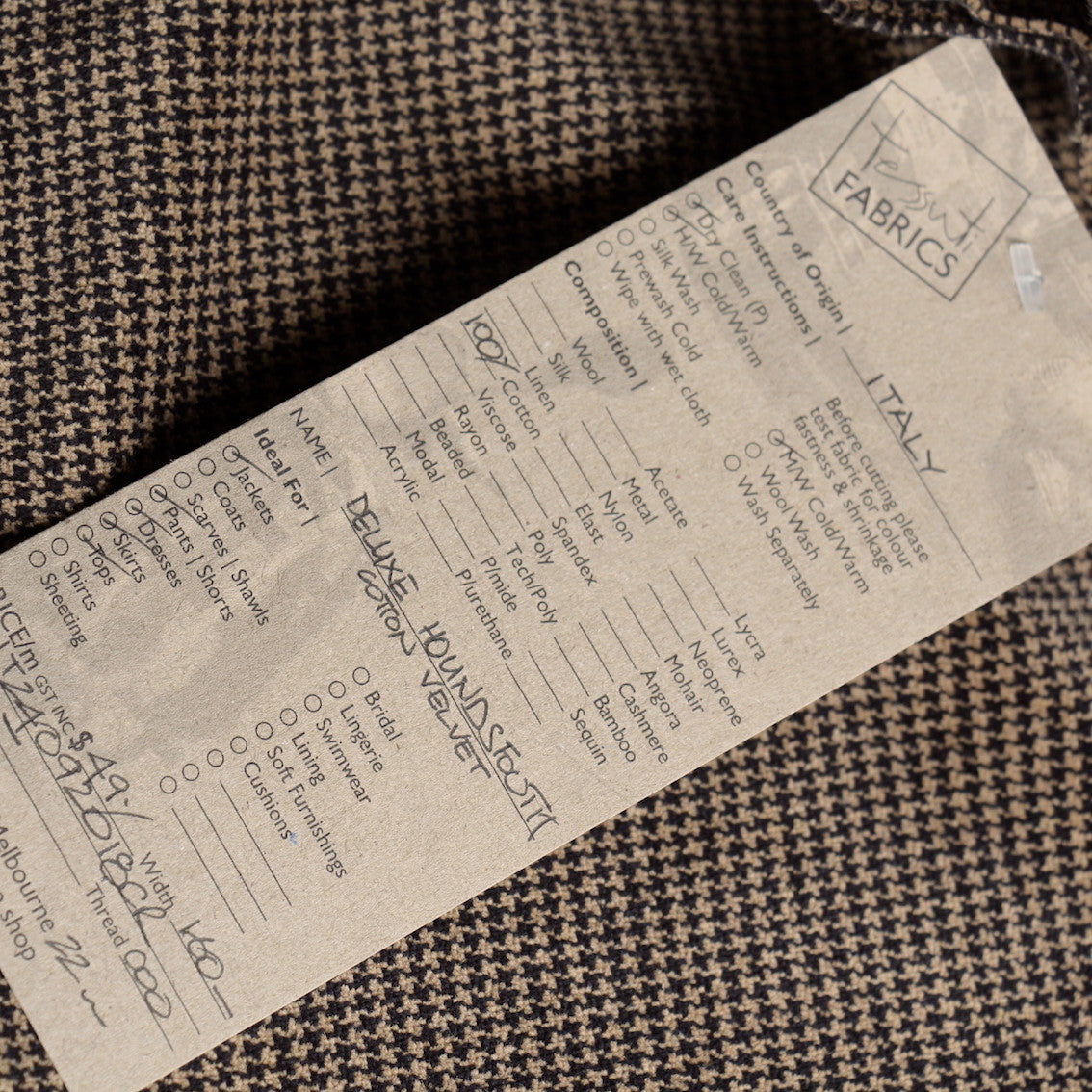 Italian designer black/gold mini houndstooth cotton/spandex stretch velvet. Width:162cm