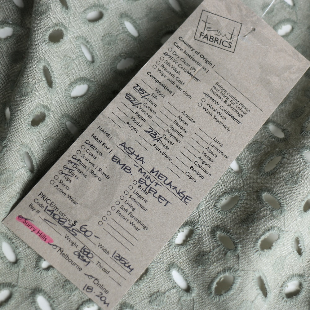 Mint green melange embroidered eyelet 52% viscose 25% linen 23% polyester