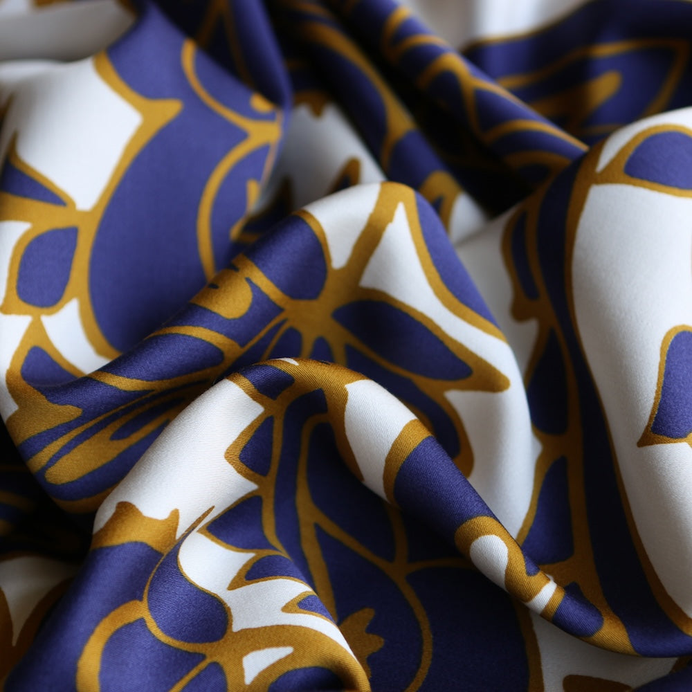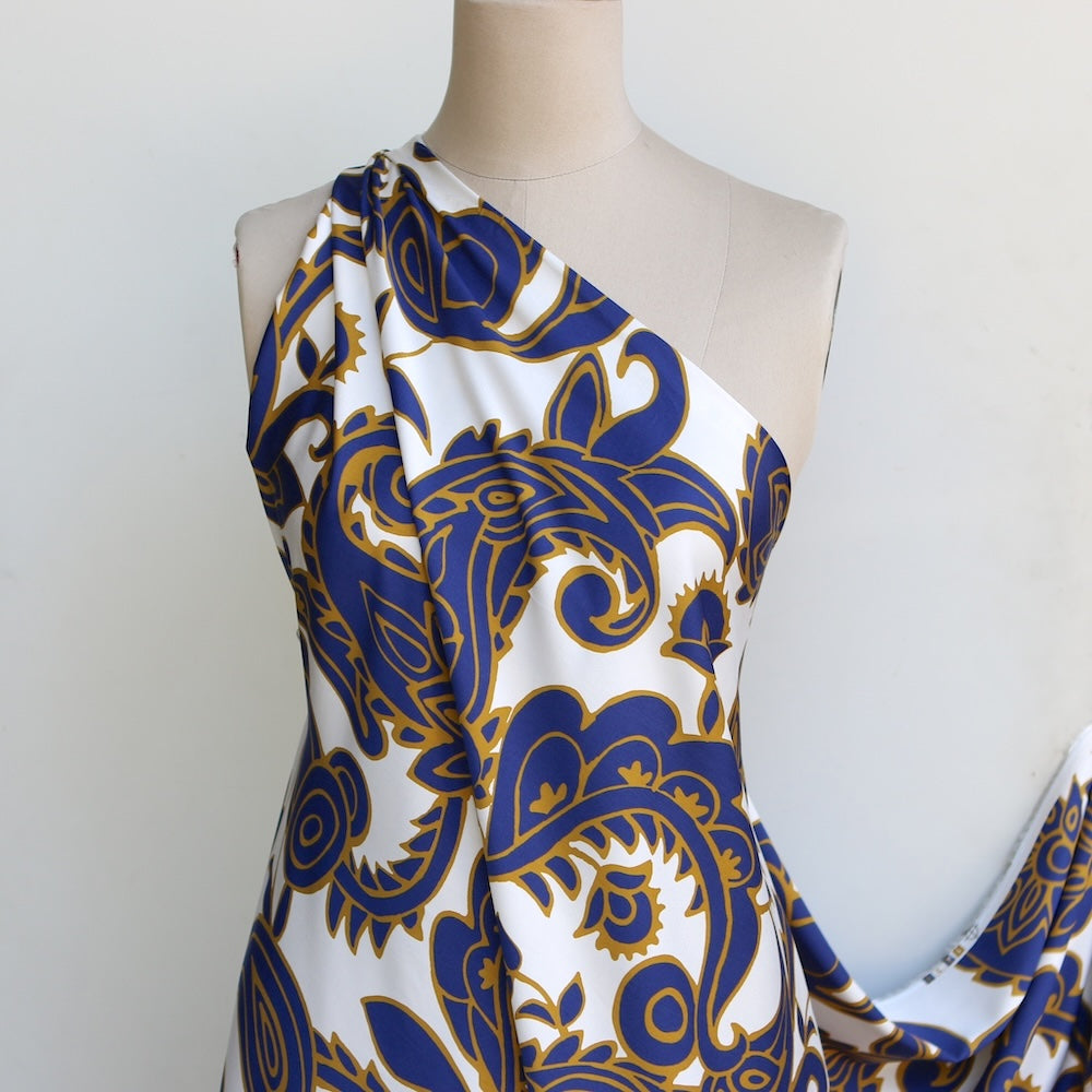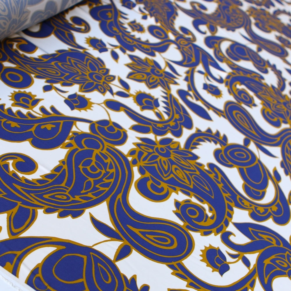 Italian designer indigo/gold paisley floral printed 100% viscose