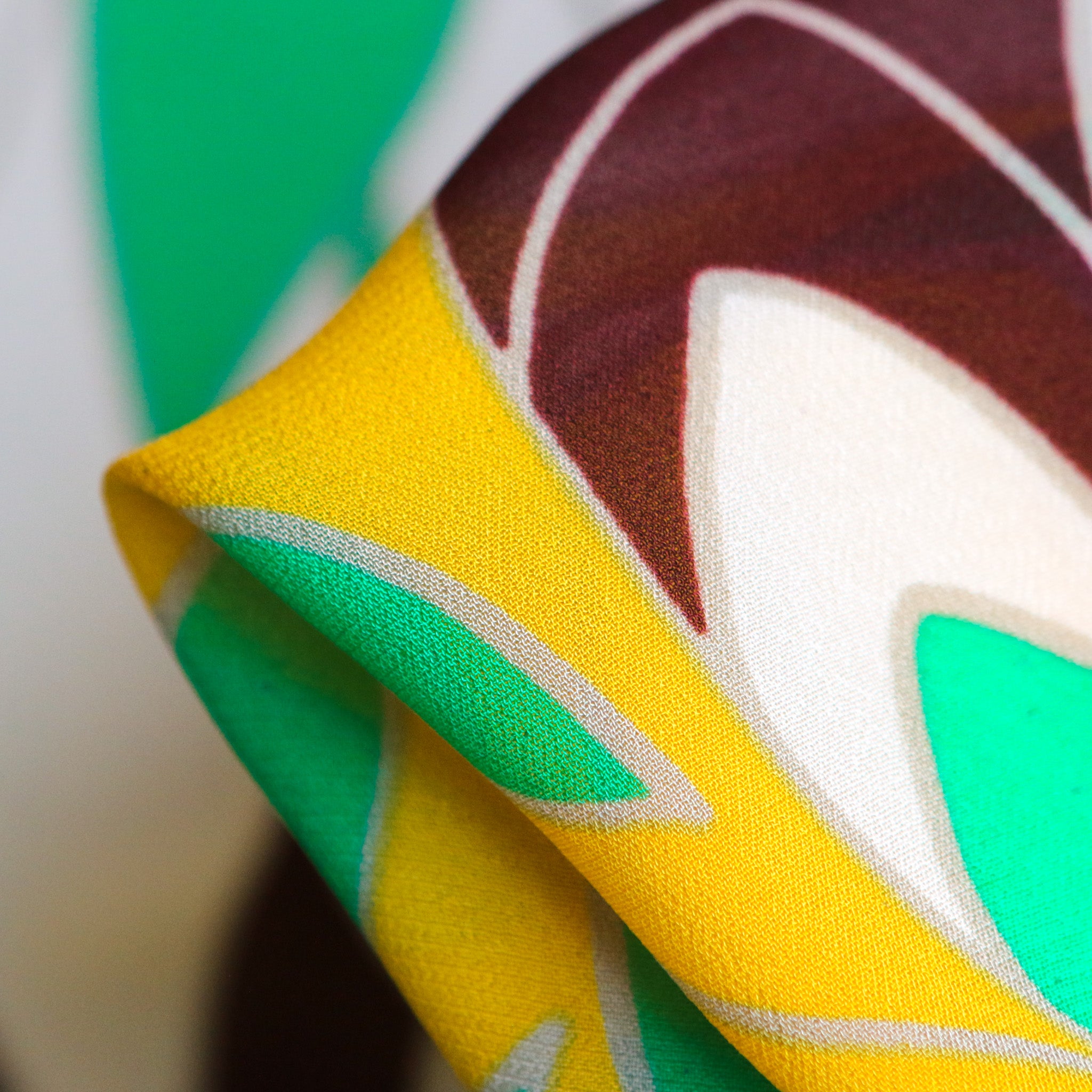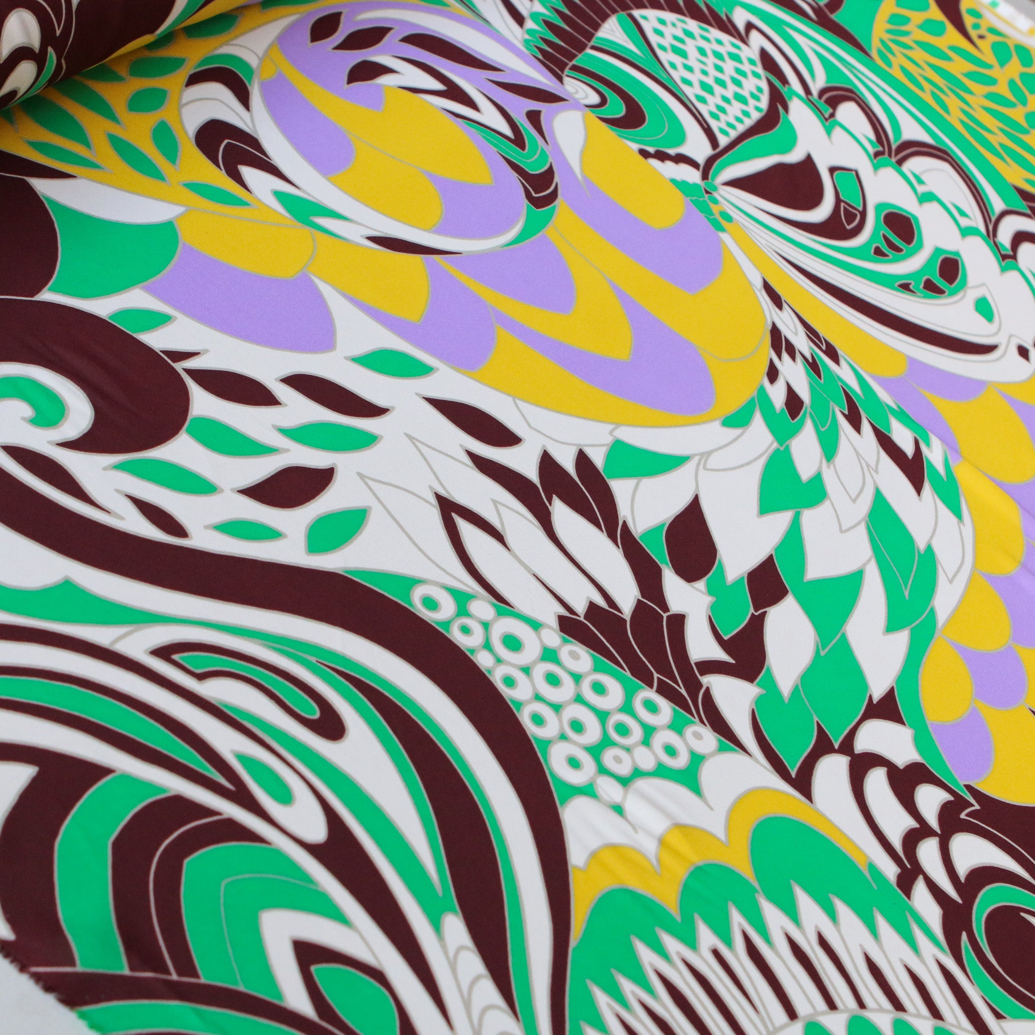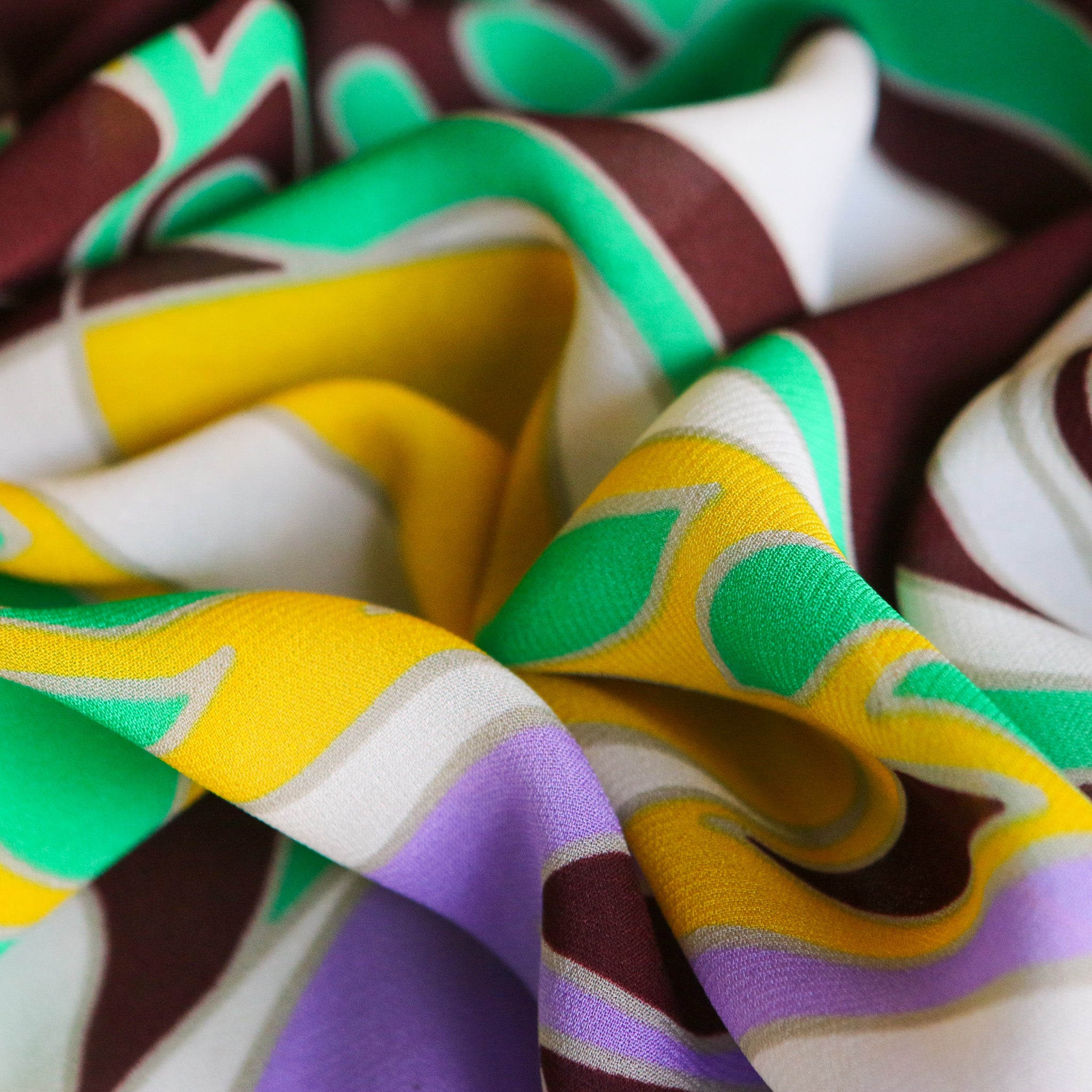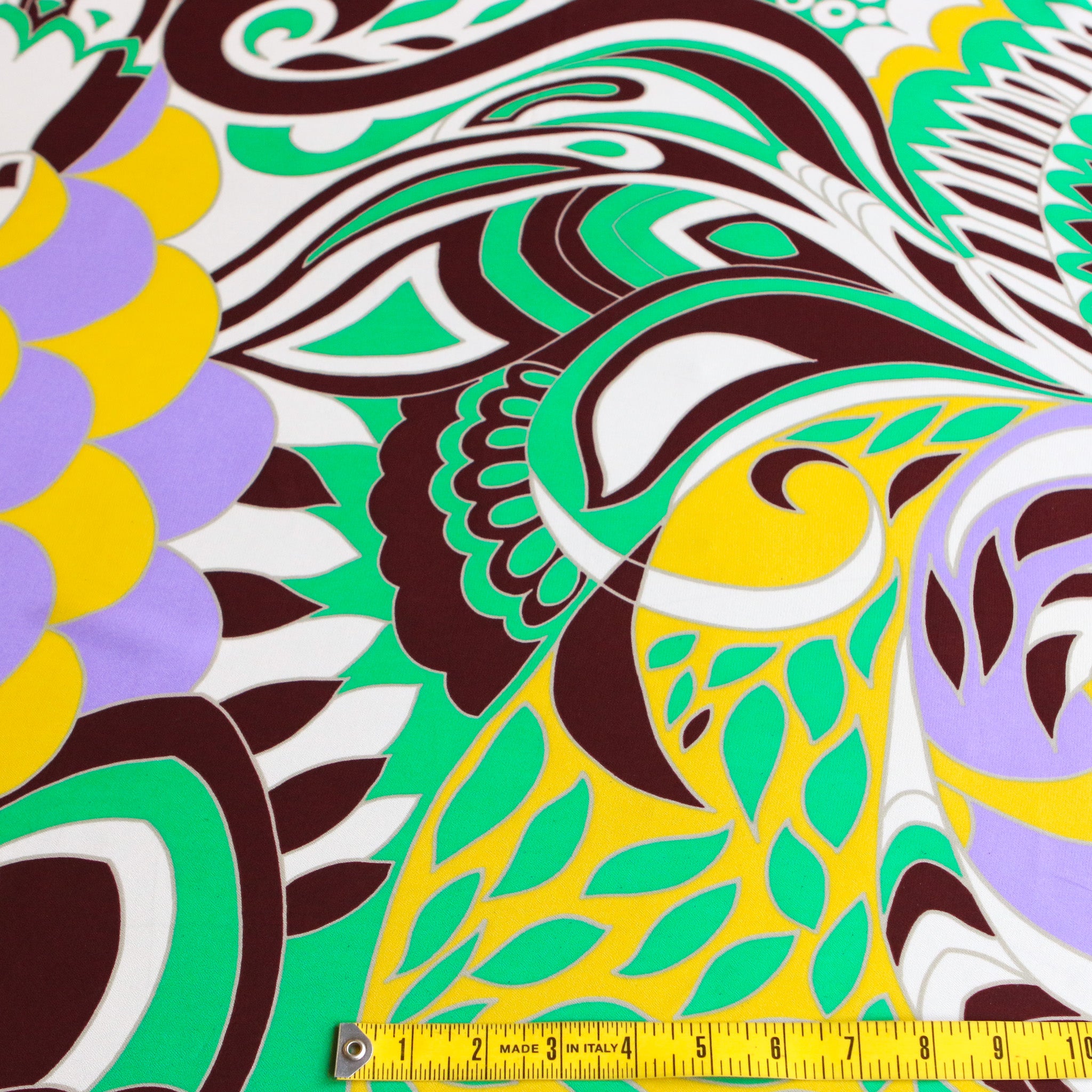 Italian brown/yellow/lilac/green printed 100% viscose georgette