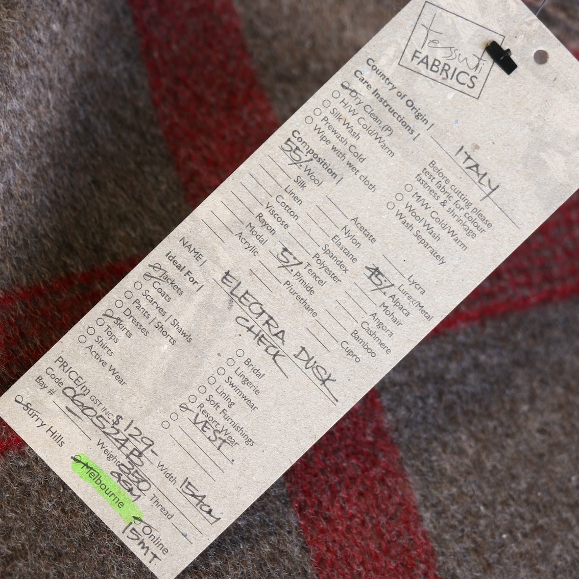 Italian taupe/red check 55% wool 45% alpaca 5% polyamide coating