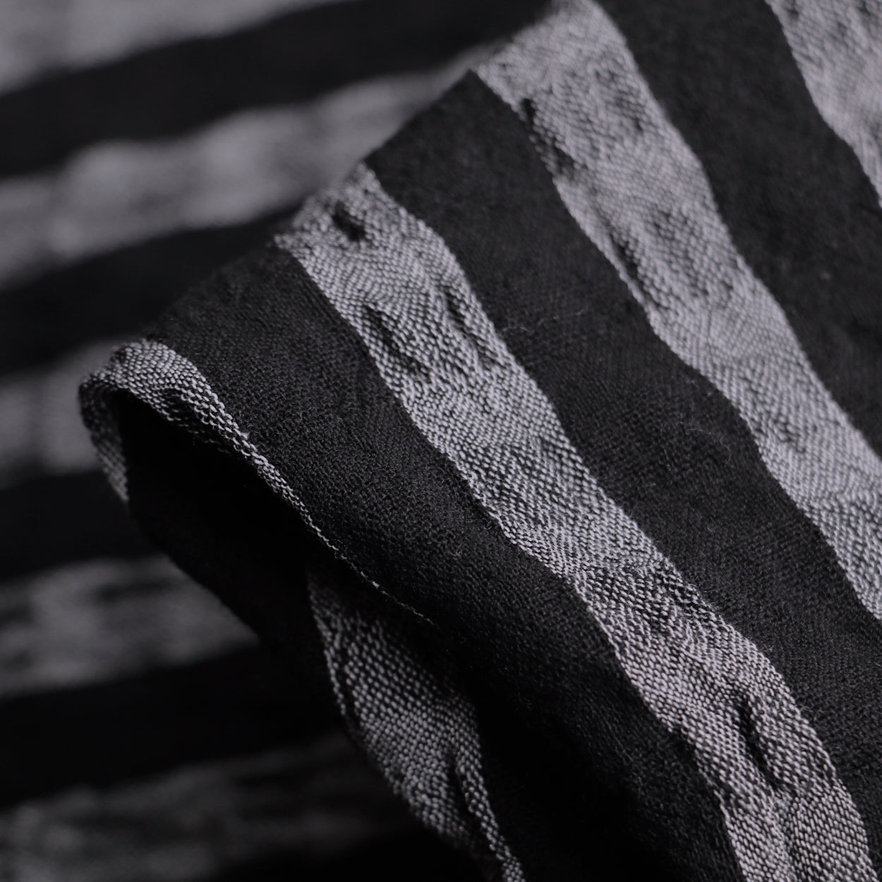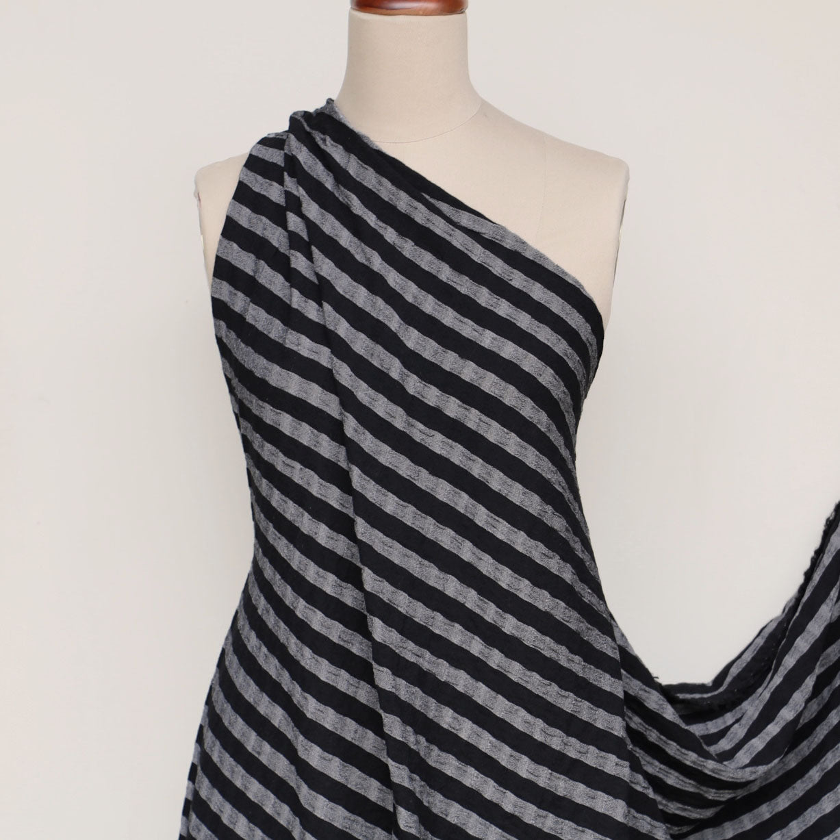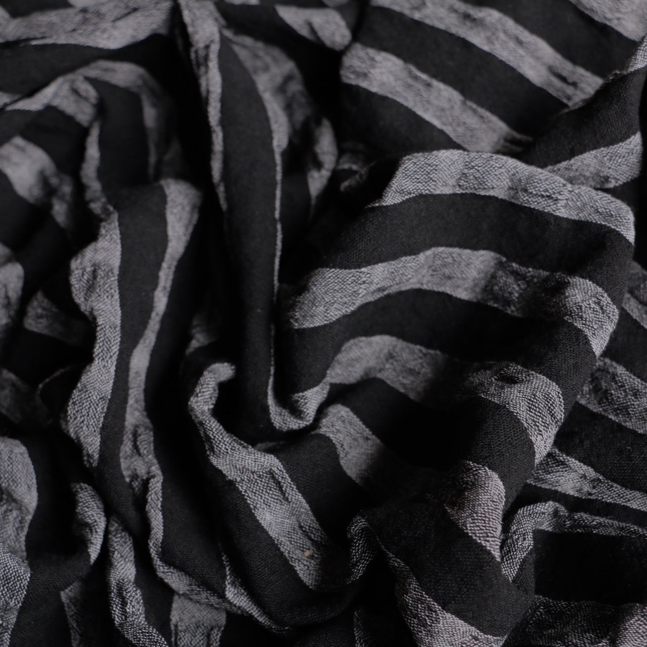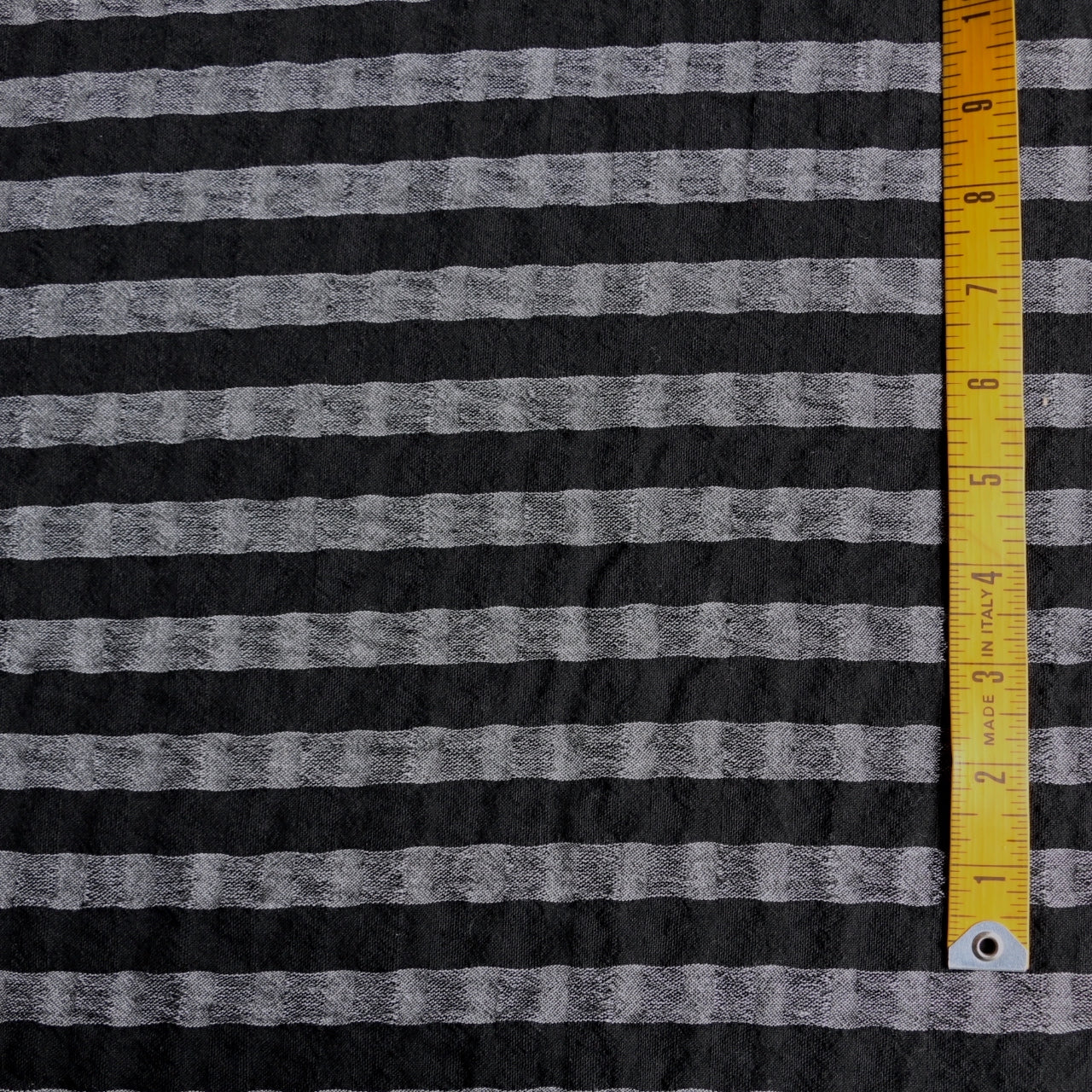 Italian yarn-dyed black/white 77% viscose 23% wool woven seersucker check/stripe