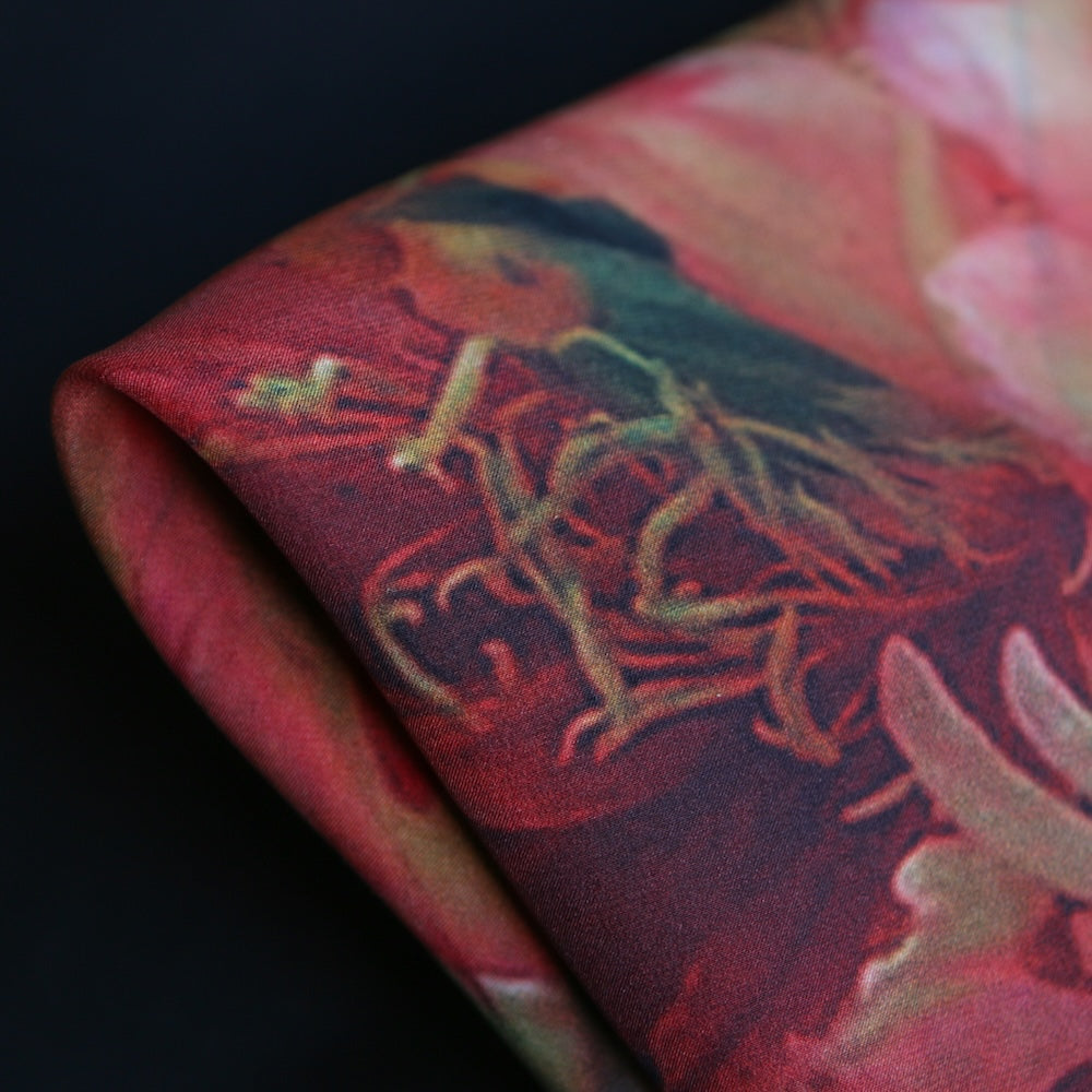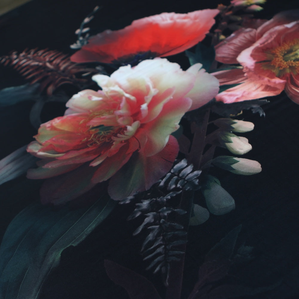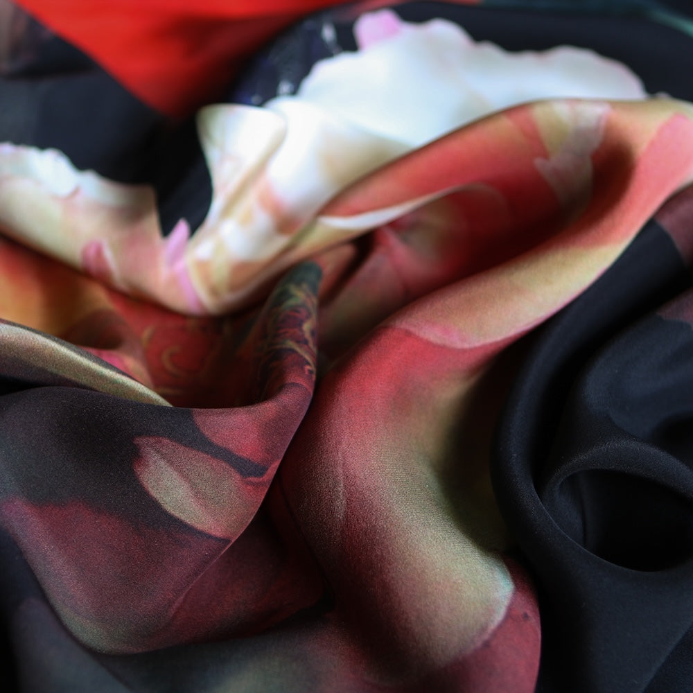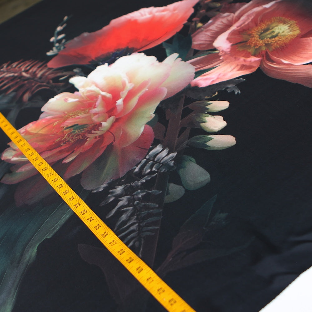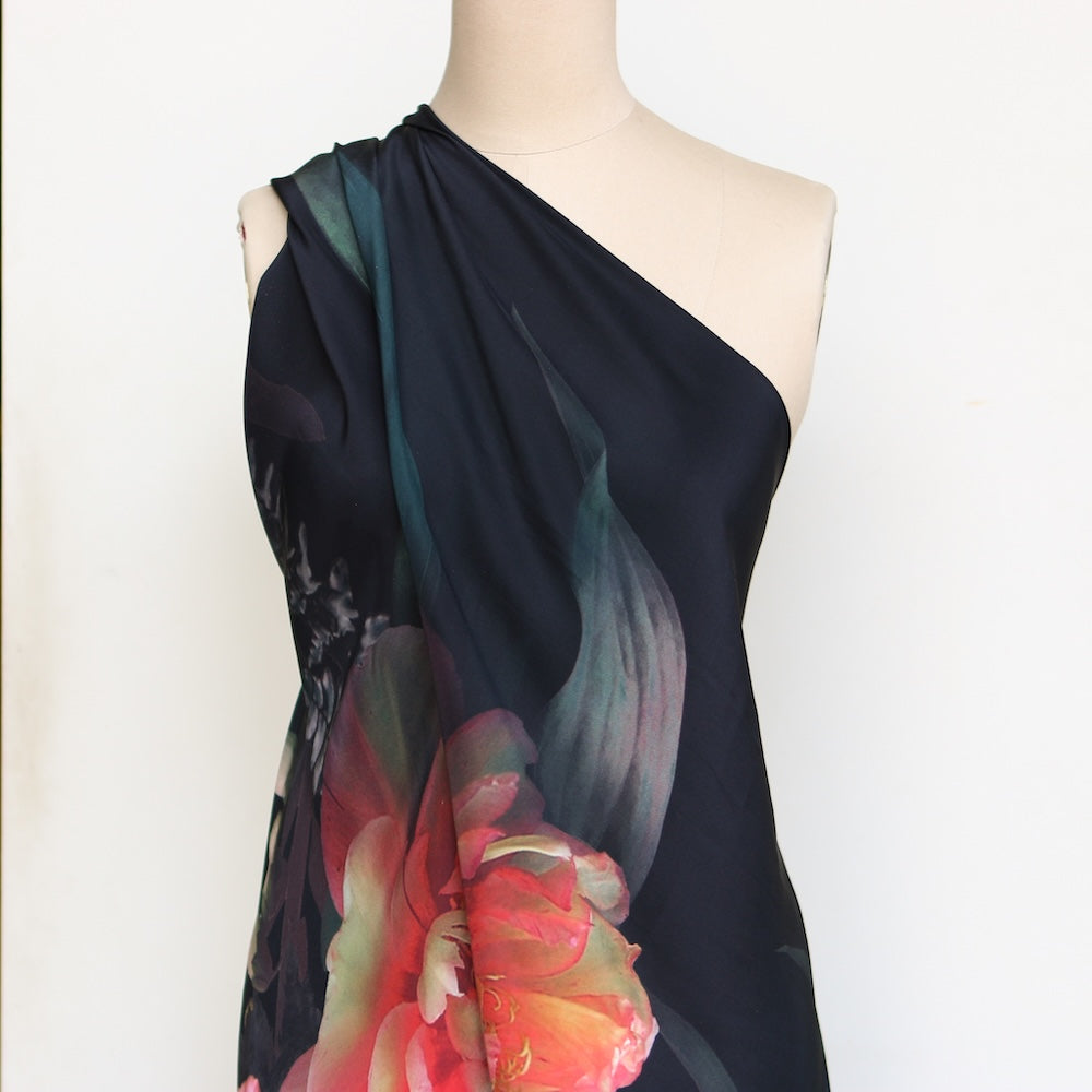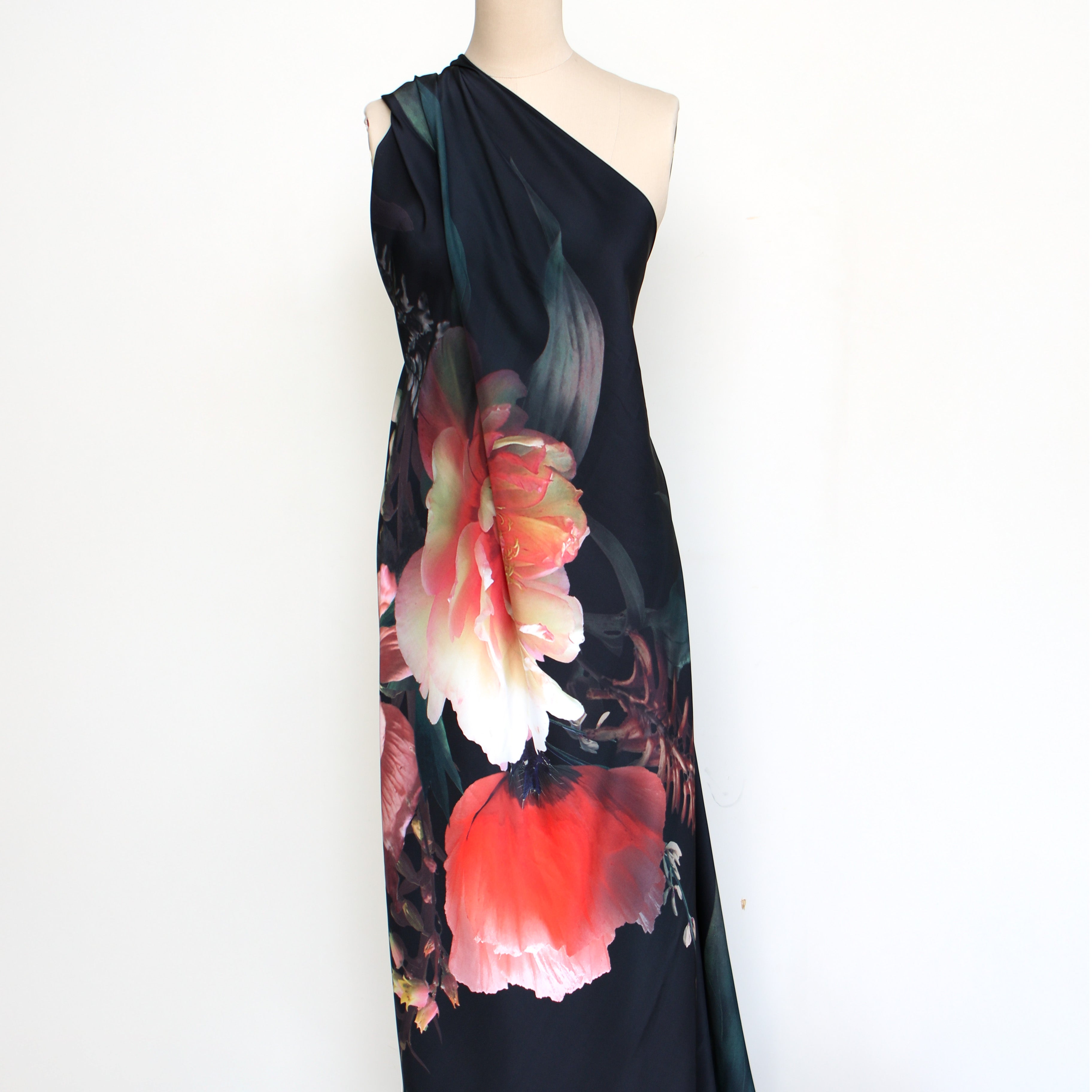 Black with large scale poppie/peonie digitally printed 100% silk (note: printed on crepe de chine side and satin on wrong side)