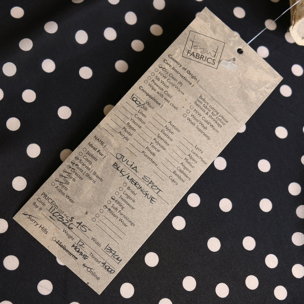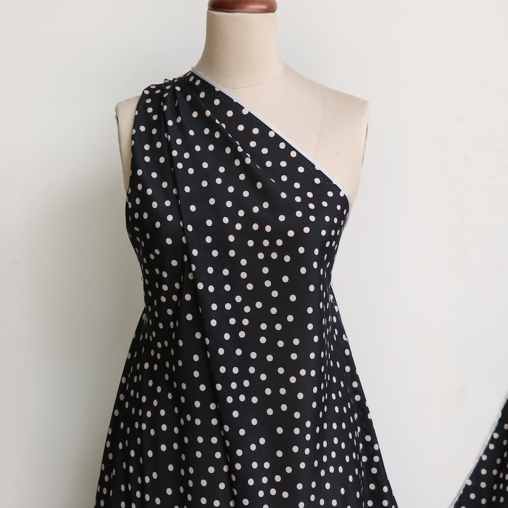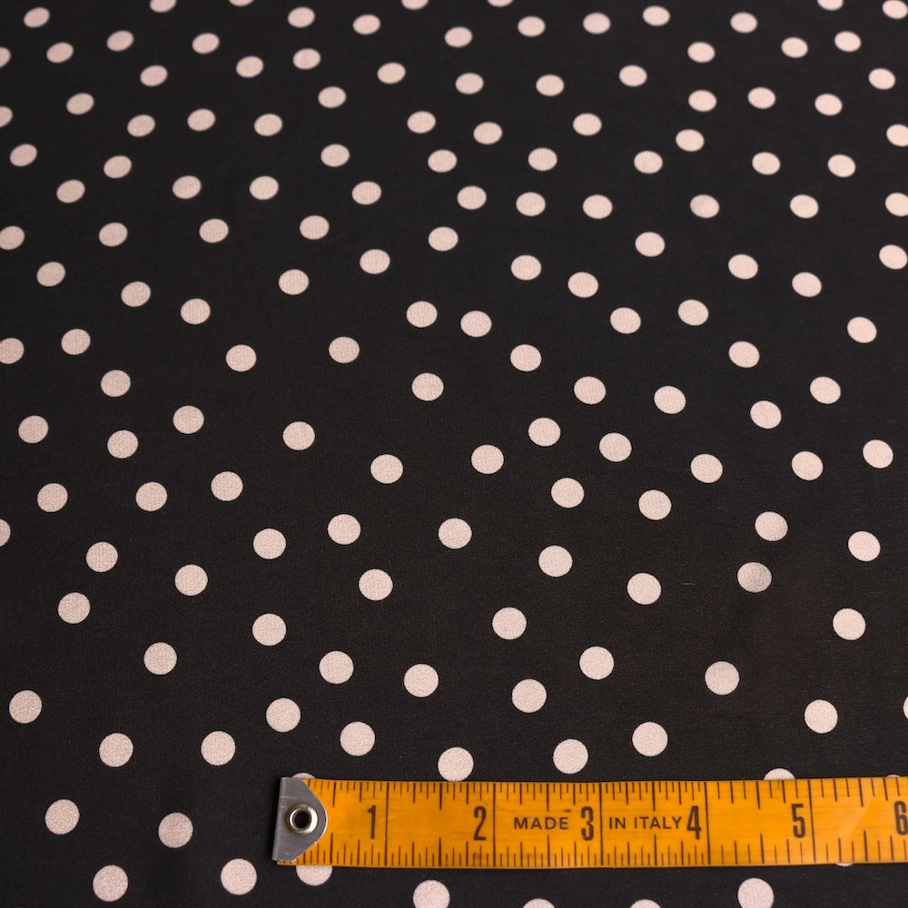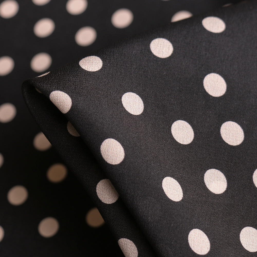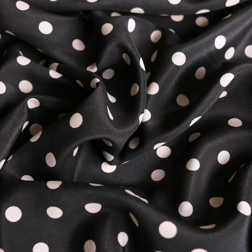 Designer end black/meringue spot printed 100% silk crepe de chine