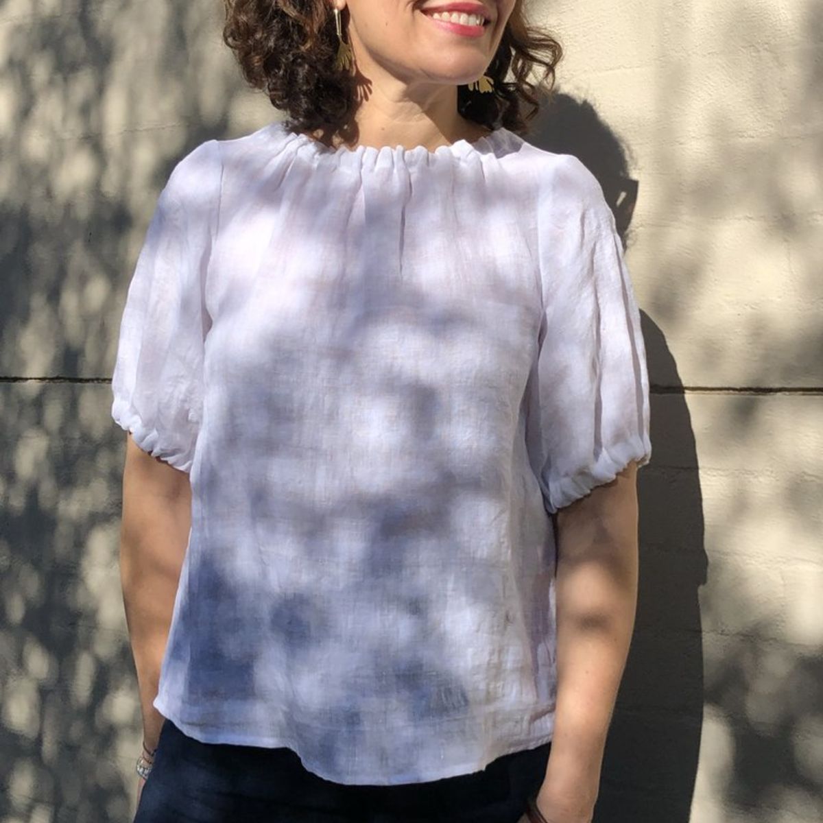 The Rae Top is a relaxed pull-on top with stylish design features including a wide, gathered neckline. The pattern includes options for a sleek sleeveless look with bound armholes (View A), cap sleeves (View B) or soft, elbow length sleeves with gathered hems (View C).